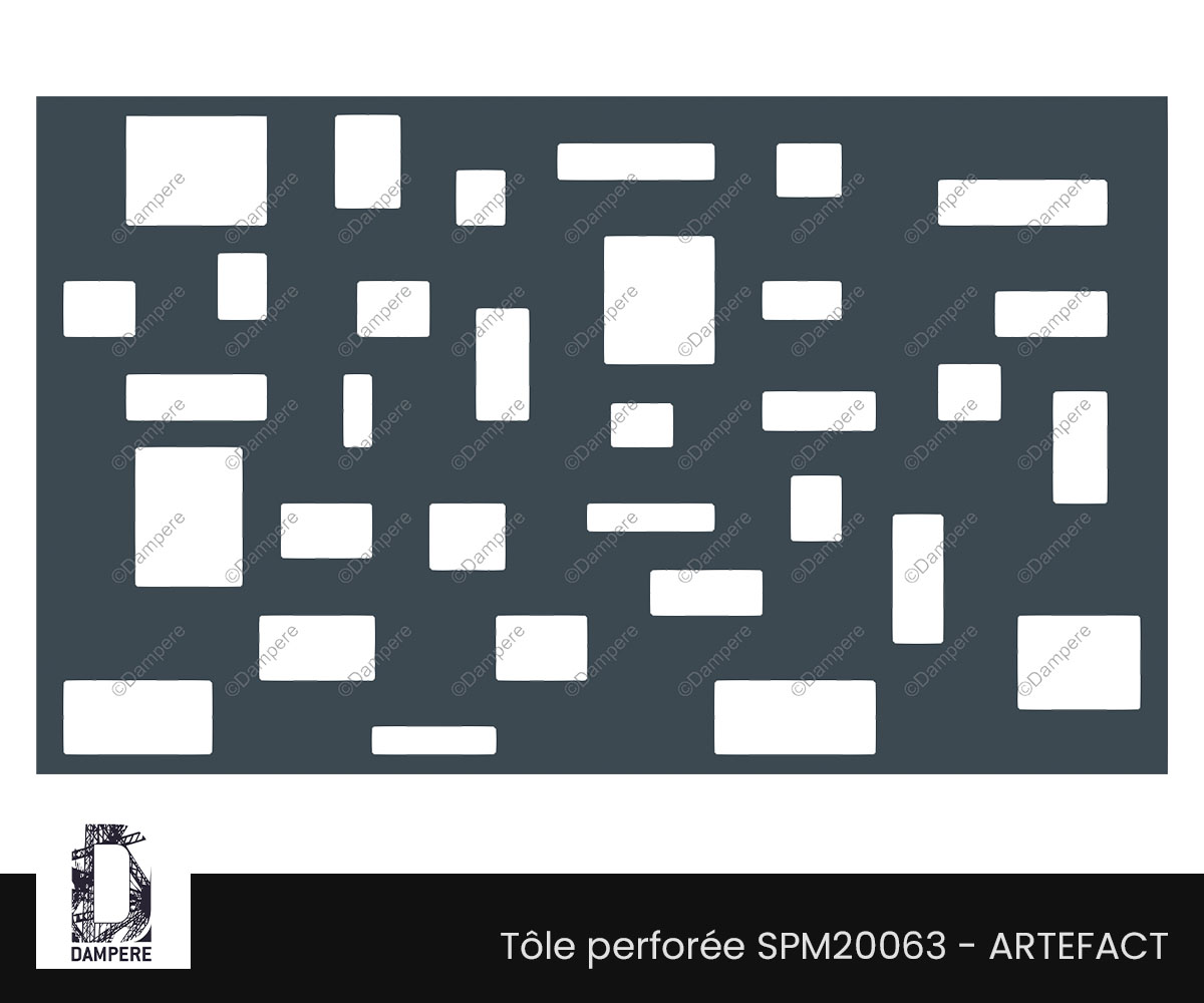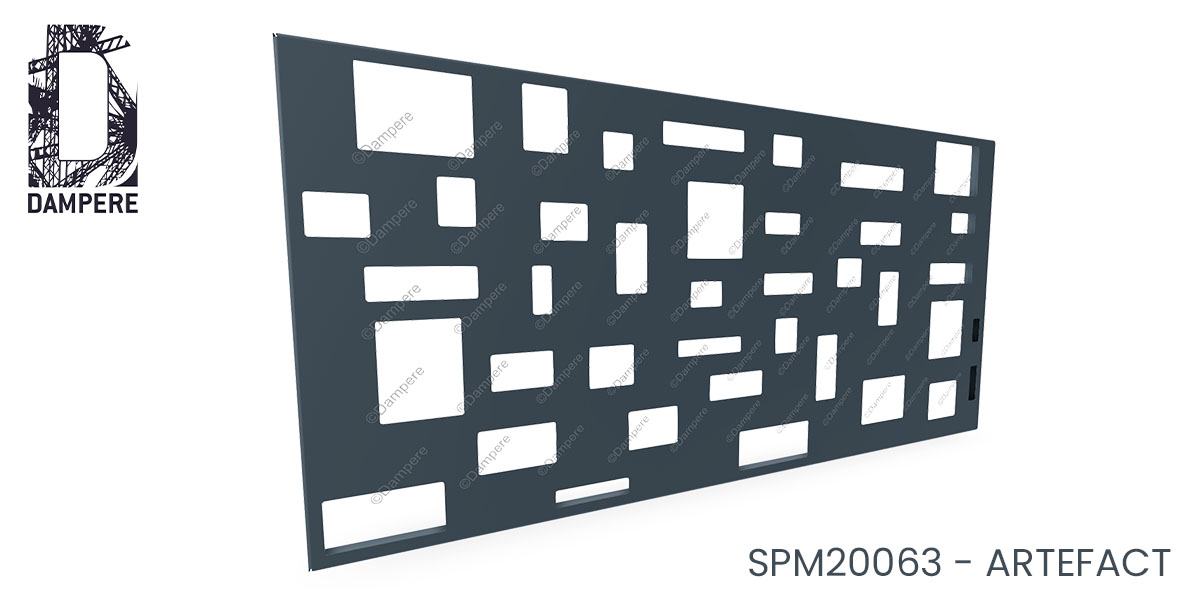 La tôle Artefact est une œuvre artistique abstraite, dotée de formes géométriques inertes qui s'animent d'un mouvement primitif. Attirant le regard, le motif opacifie la vision car l'observateur s'arrête au plan de découpe de la tôle. Utilisé en garde corps, habillage de façade et panneau de clôture métallique opaque.