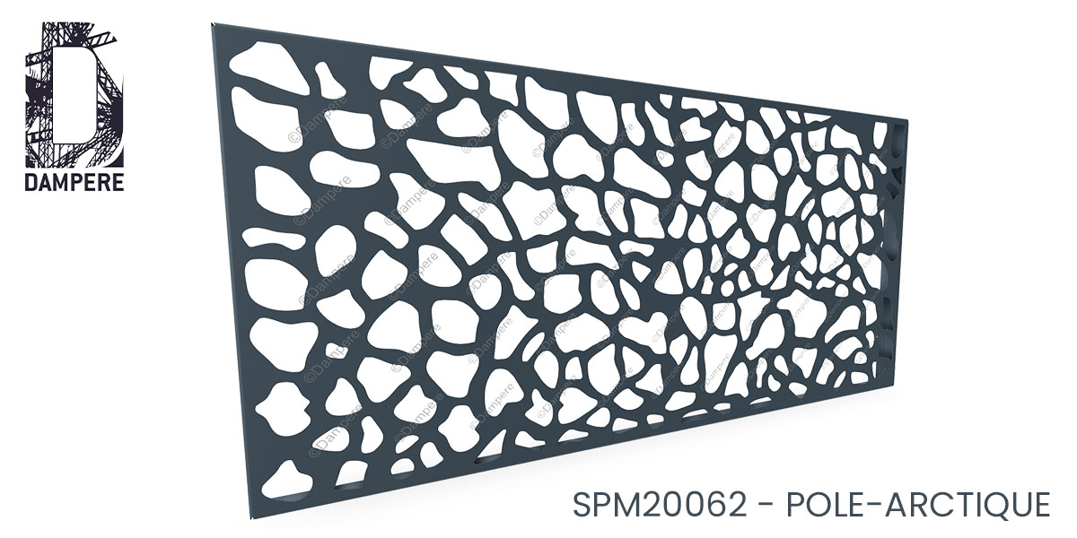 Tôle décorative Pôle Arctique en découpe laser esquisse la brisure de glace accompagnée de sa lente fusion, montrant un enchevêtrement de formes complémentaires se soustrayant les unes des autres par un glissement transversal.