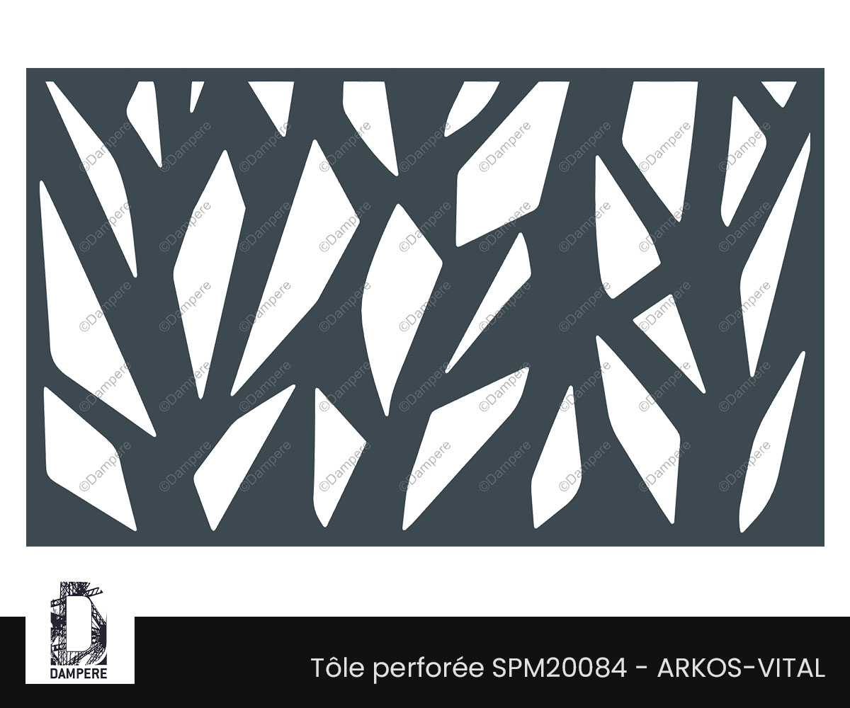 La tôle découpe laser Arkos Vital présente un motif végétal stylisé et résolument contemporain, composé de larges formes foliaires abstraites aux contours anguleux et asymétriques. Ces découpes, inspirées de feuillages alternes aux pointes abruptes, forment un jeu graphique rythmé, évoquant des végétaux stylisés en mouvement. Le motif se déploie sur la surface métallique avec une composition dynamique et volontairement irrégulière.