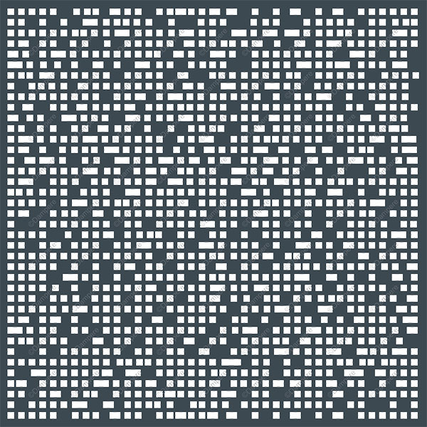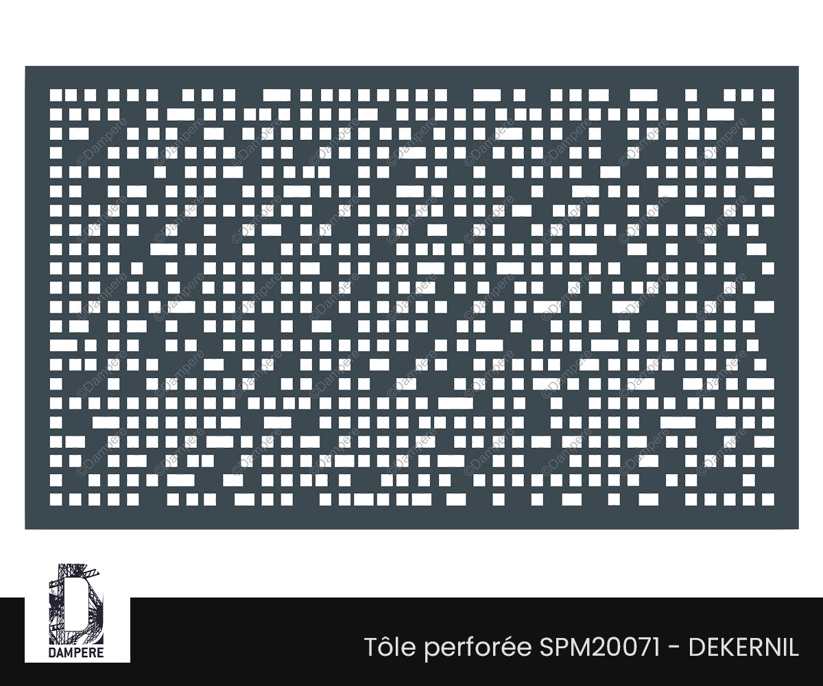 La tôle décorative Cade Dekernil présente une composition graphique rigoureuse où se succèdent des ouvertures carrées et rectangulaires alignées selon un rythme linéaire précis. Par sa géométrie de perforation, la tôle perforée exprime une écriture architecturale sobre et contemporaine, à mi-chemin entre la trame numérique d’un écran pixelisé et la régularité apaisante d’une perforation standard industrielle. Le jeu de proportions entre les pleins et les vides donne environ 35 % de transparence et permet d’obtenir une lecture homogène du motif perforé sans perte de densité visuelle, tout en laissant passer la lumière de façon diffuse.