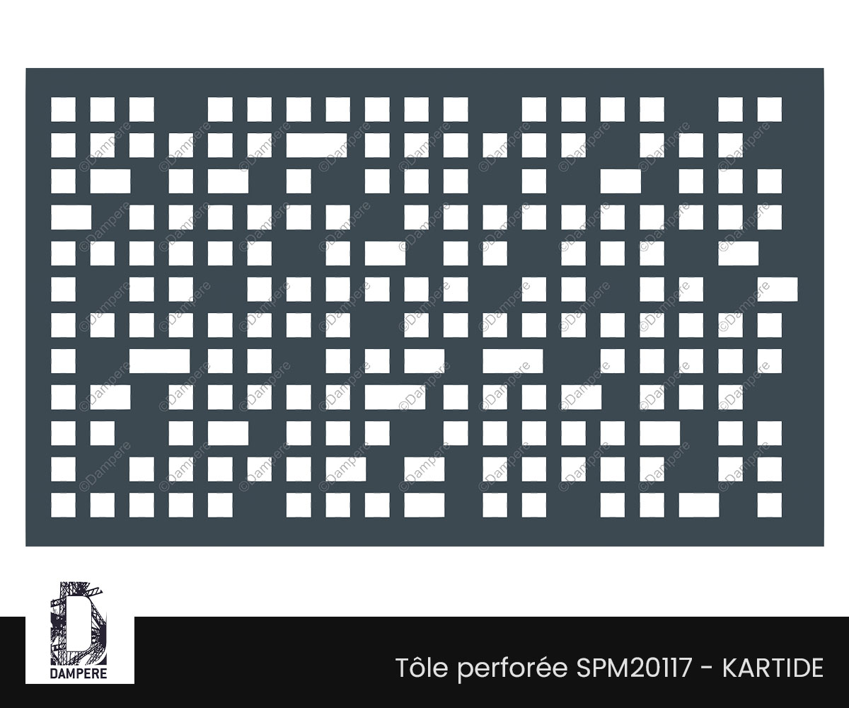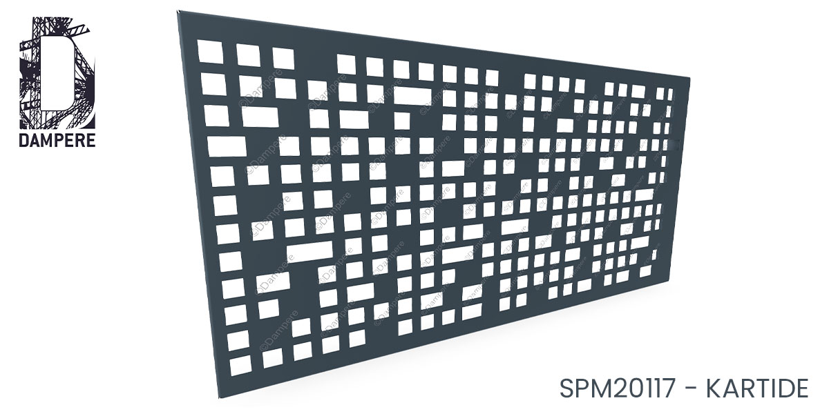 La tôle perforée aléatoire Kartide se caractérise par une grille programmée de trous carrés et rectangulaires, répartis selon une logique de rythmique visuelle contrôlée. Le moucharabieh aléatoire, vibrant au premier regard, suit une distribution conçue par algorithme, alternant zones pleines et espaces vides pour créer un effet de vibrato graphique. Chaque découpe au laser sur le métal est pensée pour accentuer la sensation de mouvement, sans jamais basculer dans le désordre visuel qui pourrait devenir oppressant. Contrairement aux tôles perforées carrées classiques issues du monde de l'industrie, la tôle perforée Kartide privilégie une approche stochastique structurée, où la variété des tailles et des positions des formes contribue à une perception dynamique du panneau métallique. Le regard est naturellement guidé par la densité variable du moucharabieh, produisant une impression de texture vivante, à la fois dense et légère. Les formes simples — rectangles fins, carrés courts, modules juxtaposés — sont découpées avec une extrême précision sur une presse à commande numérique, garantissant des arêtes franches et une parfaite netteté de bord. Ce soin dans la découpe renforce l’impact graphique de la perforation, particulièrement visible par un observateur à contre-jour ou en lumière rasante. Avec un taux de vide de 28 %, le moucharabieh métallique Kartide offre une transparence modérée, parfaite pour les situations où il s’agit de : - parois pour préserver partiellement l’intimité tout en laissant filtrer la lumière, - Claustra pour animer des surfaces métalliques sans les alourdir, - Décor pour offrir une lecture visuelle texturée à distance, et une richesse de détail en vision rapprochée. Son aspect vibrant et irrégulier crée des jeux d’ombre en constante évolution, contribuant à une esthétique architecturale subtilement rythmique, idéale pour les environnements modernes, les façades de bâtiment tertiaire, les brise-vues urbains ou les clôtures design. La tôle perforée aléatoire Kartide est donc une solution élégante pour structurer sans enfermer, masquer sans opacifier, et animer l’espace sans surcharge décorative. Le prix de la tôle perforée Kartoide en acier galva ep 1.5 mm de 50€/m² à 85 €/m² pour 100 m² selon les formats de calepinage du projet d'habillage métallique