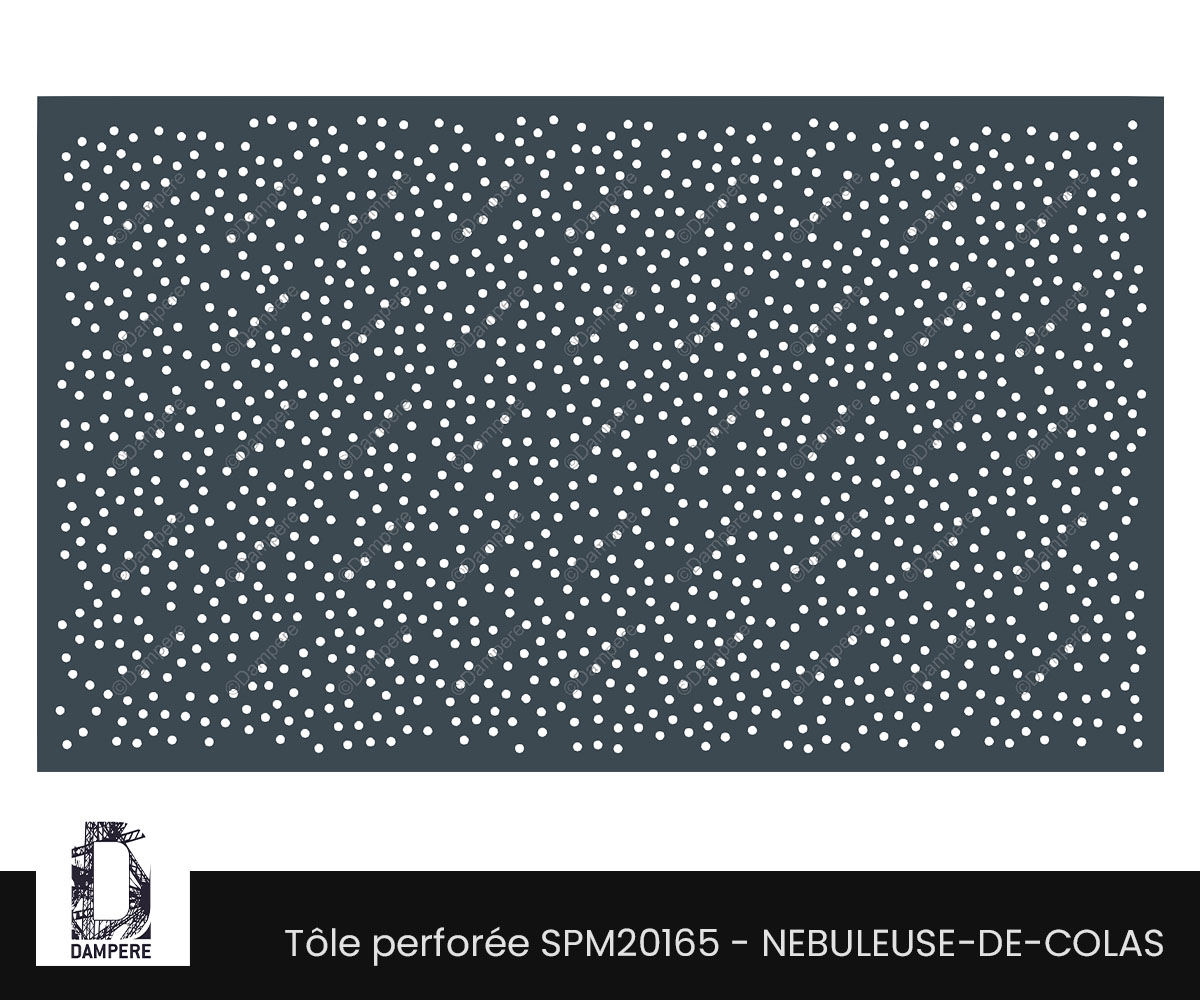 Le panneau opaque Nébuleuse de Colas présente un dessin délicatement dispersé de micro-perforations circulaires, réparties sans répétition apparente. Chaque trou finement percé, d’un diamètre modeste, participe à une composition libre et subtile, évoquant une poussière d’étoiles suspendue, un ciel de nuit parsemé. L’amas de percement donne l’impression d’un nuage graphique en suspension, flottant à la surface du métal.