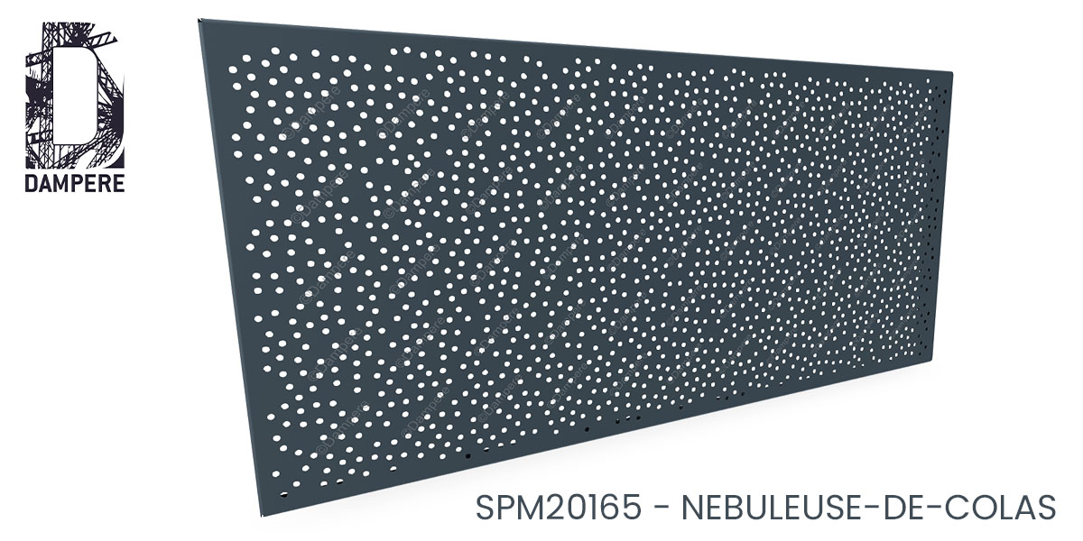 Contrairement aux tôles perforées classiques, dans ce motif à peine ajouré, l’aléatoire est assumé comme une esthétique à part entière : les points semblent posés comme par le vent ou une sédimentation légère, générant une texture floue, sans symétrie, ni repère fixe. Ce désordre maîtrisé dans la tôle perforé produit un effet de voile léger, presque vaporeux, qui floute le regard sans le bloquer, créant un filtre visuel doux.