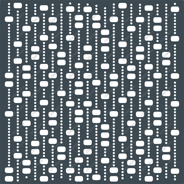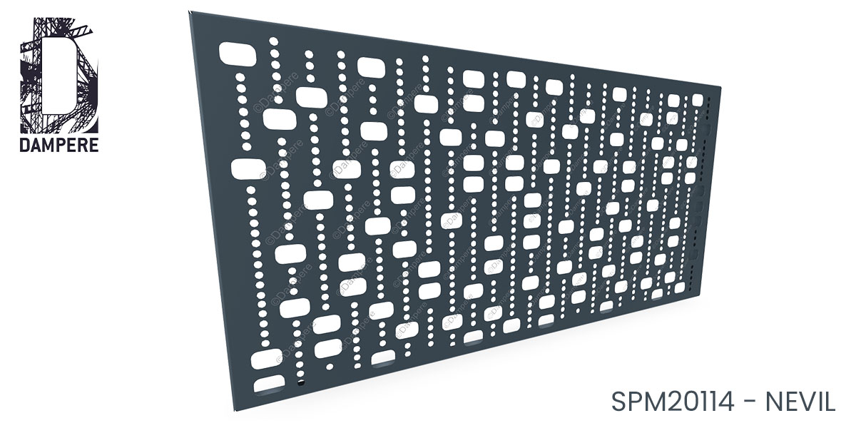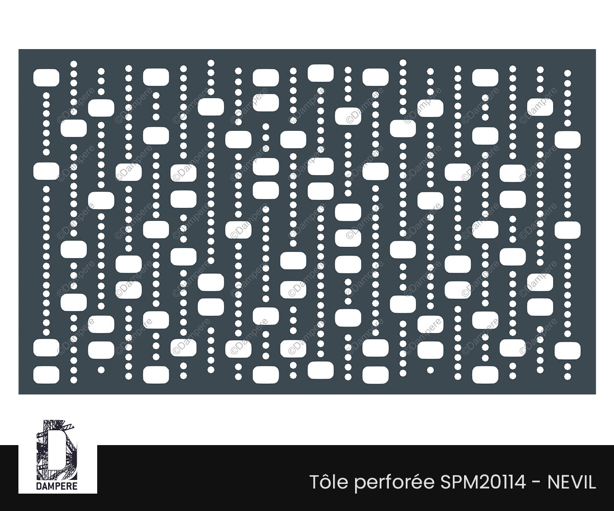 La tôle perforée décorative Nevil présente un motif graphique contemporain constitué de rectangles arrondis et de cercles alignés en séquences verticales. Chaque ligne évoque un moucharabieh ou un rideau stylisé, créant une trame visuelle rythmée et répétitive. Ce motif perforé évoque une écriture abstraite, à la fois fluide et rigoureuse, rappelant les perforations numériques ou les textiles techniques.