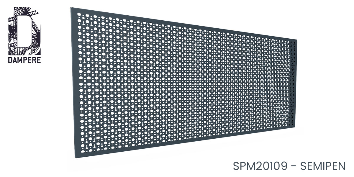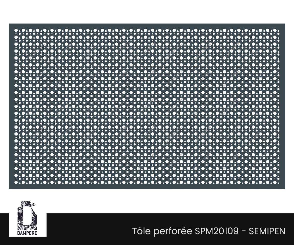 Le moucharabieh métallique Semipen se caractérise par un motif régulier et structuré, composé de grands trous ronds, alignés verticalement et horizontalement, et ponctués à intervalles réguliers de petits trous circulaires. L’ensemble est organisé selon une grille métallique orthonormée, où chaque rangée de perforations alterne les tailles de cercles pour créer une rythmique vibrante et visuellement dynamique, tout en conservant une grande lisibilité géométrique appréciée pour la restauration du patrimoine. Ce jeu d’échelle entre grandes et petites perforations crée un effet visuel en cascade, comme une pluie d’étoiles ou une trame organique rationalisée. Les petits trous agissent comme des pépites visuelles entre les formes dominantes, évitant toute lourdeur graphique. Ce moucharabieh dynamique confère au panneau une lecture à double échelle : homogène et texturée de loin, riche en détails arrondis de près. La transparence supérieure à 40% de vide positionne la tôle de patrimoine Semipen dans la catégorie des panneaux fortement ajourés, mais dont la structure reste équilibrée et élégante grâce à la régularité des alignements. Cette forte ouverture rend la tôle idéale dans les cas où l’on cherche à : - favoriser la circulation d’air et de lumière dans un site classé, - protéger visuellement sans obstruer le Bâtiment ancien, Découpée avec précision sur acier d’épaisseur 1,5 mm, la Semipen présente des bords nets, parfaitement calibrés, qui renforcent la netteté du rendu général et assurent une grande résistance mécanique pour des applications extérieures comme intérieures. Selon l’incidence de la lumière, le motif évolue subtilement : - en lumière rasante, les petits cercles captent la lumière comme des éclats, soulignant la trame de fond, - en rétroéclairage, les grands cercles deviennent dominants et génèrent des jeux d’ombres marqués qui animent les murs, sols ou façades qu’ils habillent. Le moucharabieh Semipen évoque un équilibre entre rigueur industrielle et mouvement fractal, en s’inscrivant dans une esthétique moderne, épurée et répétitive. Sa rythmique de perforation soutenu, en fait une solution de choix pour les projets cherchant à marier transparence, texture et géométrie avec sobriété. Le prix de la tôle patrimoine Semipen en acier galva ep 1.5 mm varie de 75€/m² à 95 €/m² pour 100 m² selon les formats de calepinage du projet d'habillage métallique.