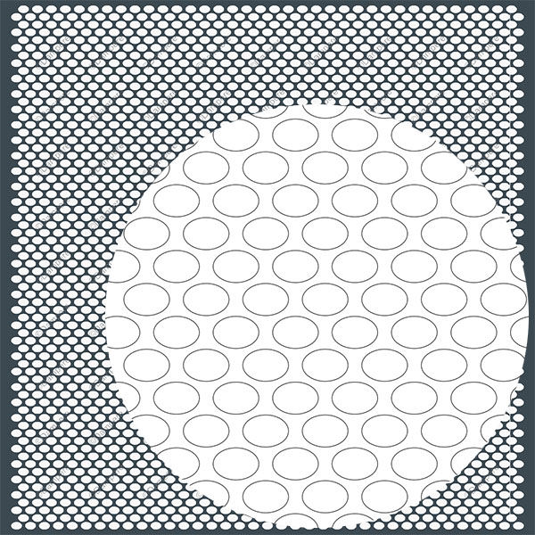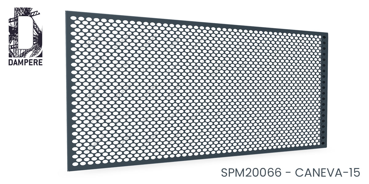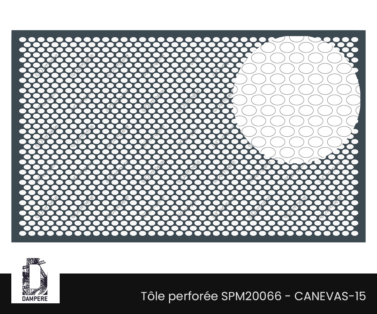 La tôle perforée pour ventilation Canevas 15 DAMPERE sert dans tout type de petit aménagement intérieur et extérieur, pour lequel l'observateur reste assez proche pour découvrir le détail de la morphologie du trou. Dans les applications d'aménagement urbain, le motif permet d'offrir un taux de transparence élevé en conservant la résistance mécanique de la tôle. La perforation dépasse 50 % de vide atteignant presque 60 % de transparence.