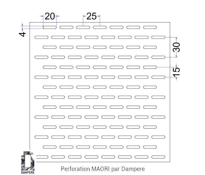 La tôle perforée LR 4×20 Z 15×25 – Maori propose une écriture allongée et précise : des trous perforés oblongs de 4×20 mm, disposés en quinconce sur un pas de 15 mm dans la petite direction et 25 mm dans la grande. Dans cette géométrie perfo, le vide atteint environ 21 %, niveau de transparence moyen, pratique dès qu’il faut adapter le passage d’air utile, l'apport lumineux maîtrisé et lecture visuelle calme. La disposition décalée en "Z" homogénéise la diffusion des ouvertures et génère un tramage de formes souples, tout en préservant la présence linéaire du motif oblong.