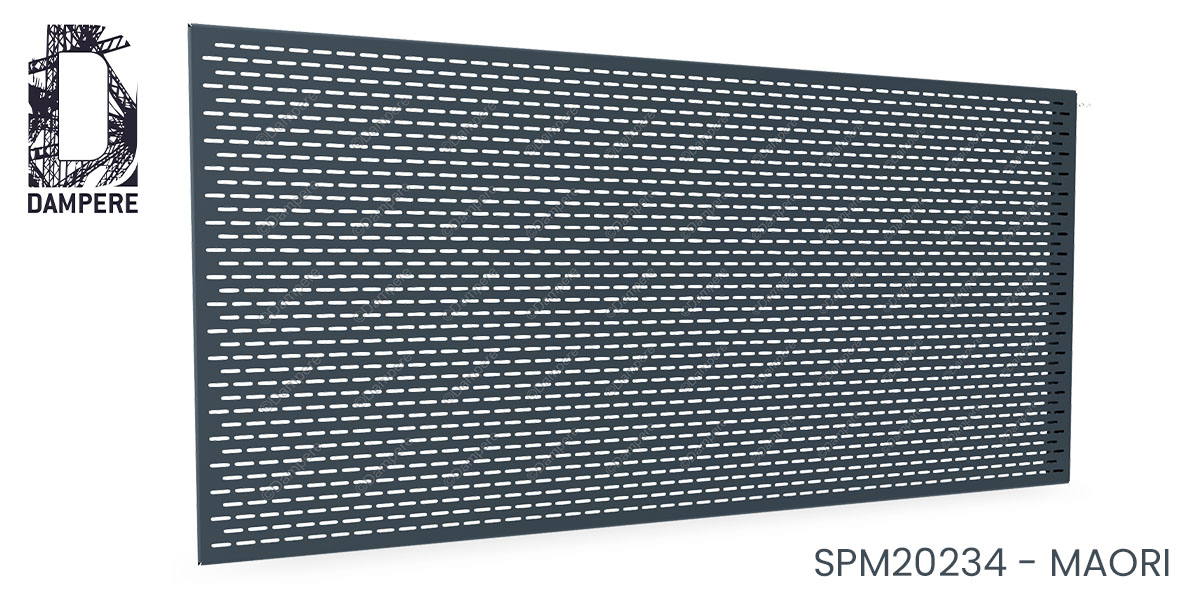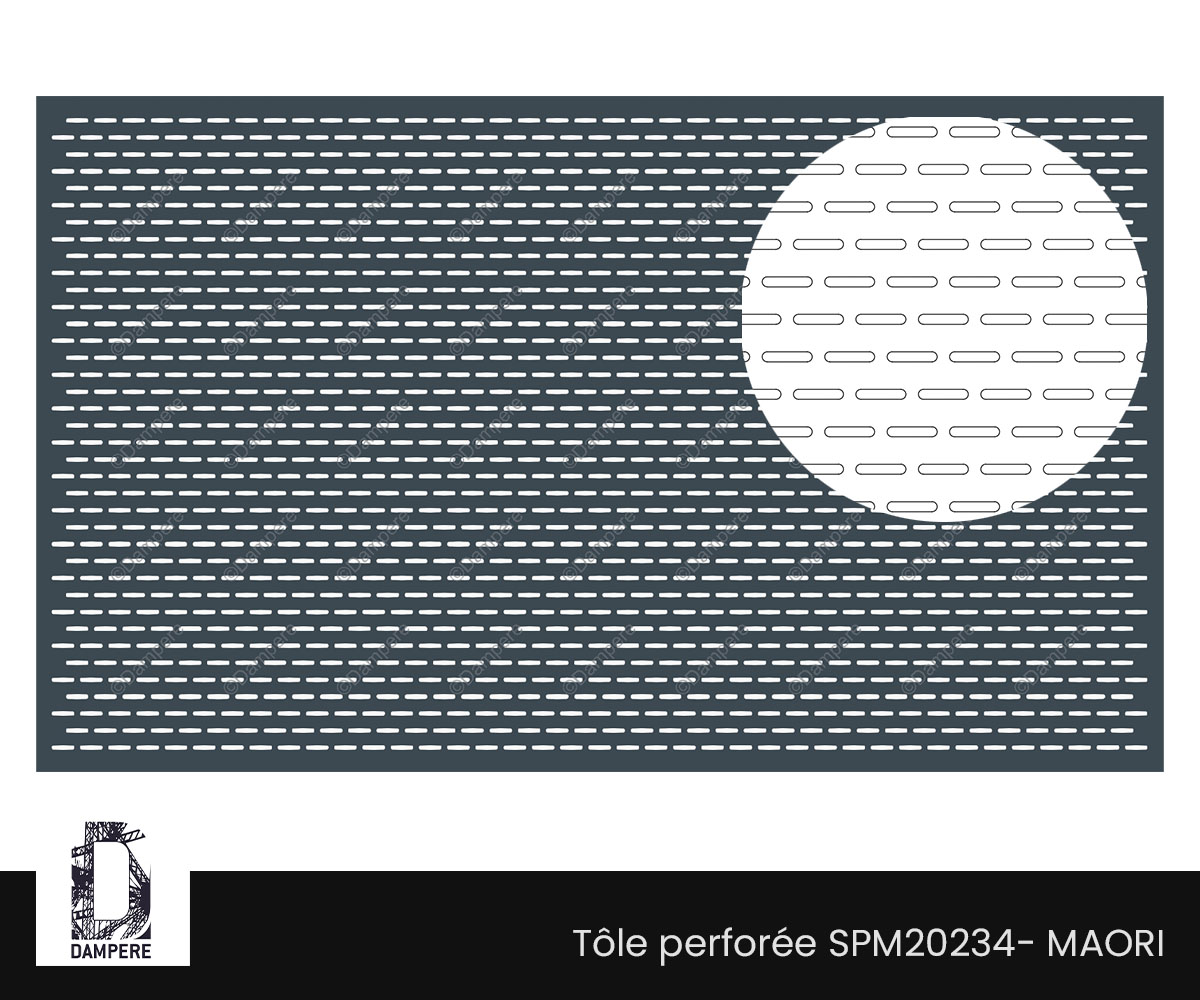Le trou perforé de 4×20 mm imprime une signature élégante et orientée. Posé à l’horizontale, il étire visuellement les façades et adoucit la perception des volumes ; à la verticale, il renforce l’effet de hauteur et élance le Bâtiment. Ce motif perforé Maori convient aux parements rapportés, écrans techniques, capotages d’équipements CVC, faux-plafonds et cloisons filtrantes, lorsque l’on recherche une granularité fine, une ventilation modérée et un masquage efficace de l’arrière-plan.