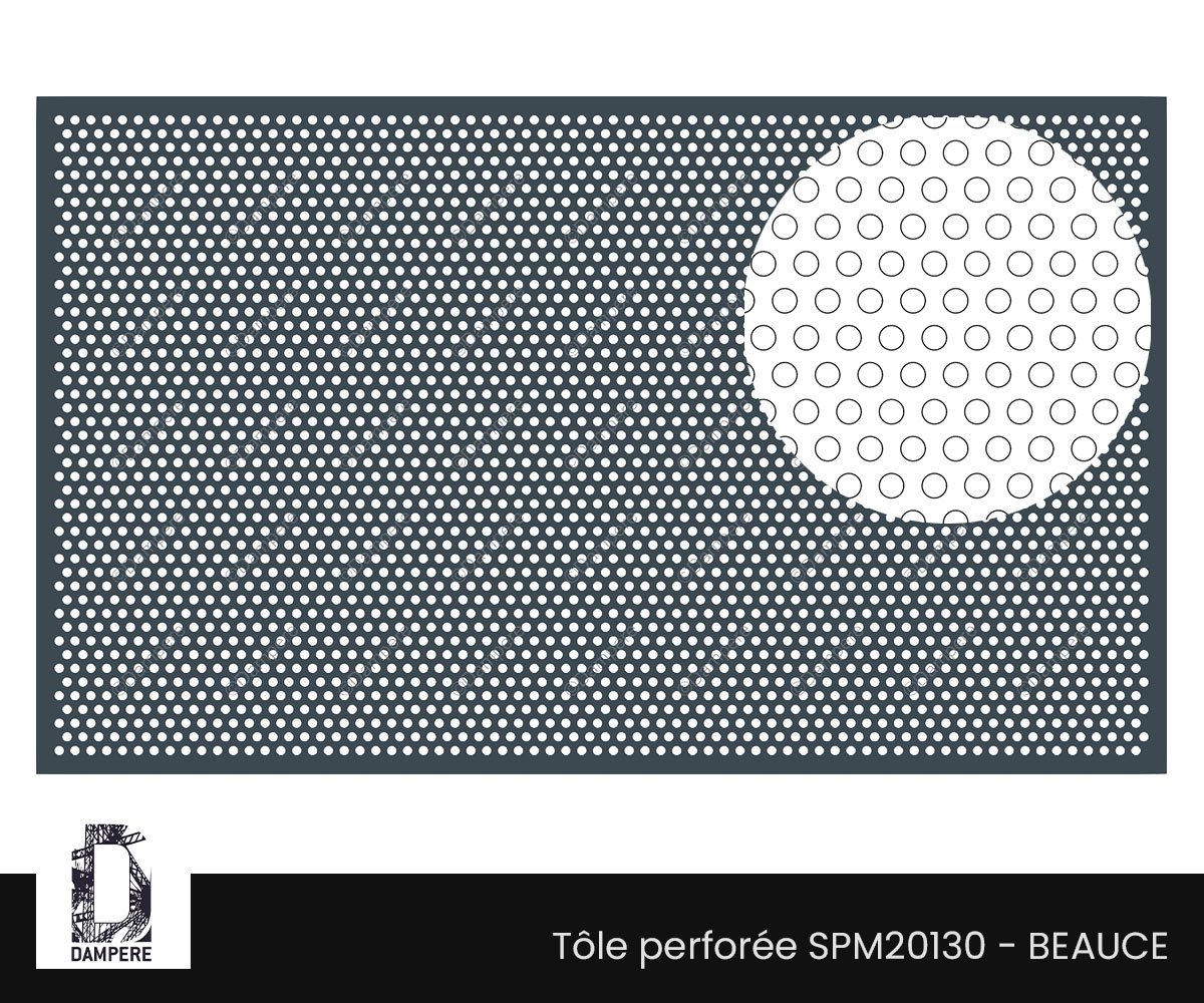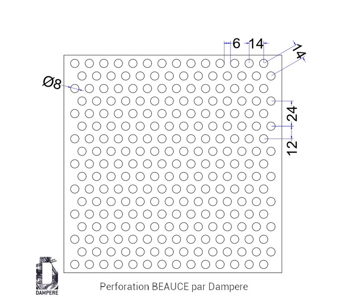 La disposition de perfdoration en quinconce ( nomenclature en T ) optimise le “remplissage” de la surface perforée par rapport à une trame régulière en ligne : la répartition des ajours est plus isotrope, ce qui se traduit par une ventilation mieux répartie, des ombres plus douces et une perception moins directionnelle de la grille de ventillation. Visuellement, la Tôle perforée Beauce – R8T14 produit une texture régulière et “lisse” ; vue de loin, la surface gagne en uniformité ; vue de près, le disque de 8 mm dessine un pointillé net, discret et contemporain, apprécié sur les façades techniques, capotages, caissons d’habillage, écrans de ventilation pour locaux poubelles ou équipements HVAC.