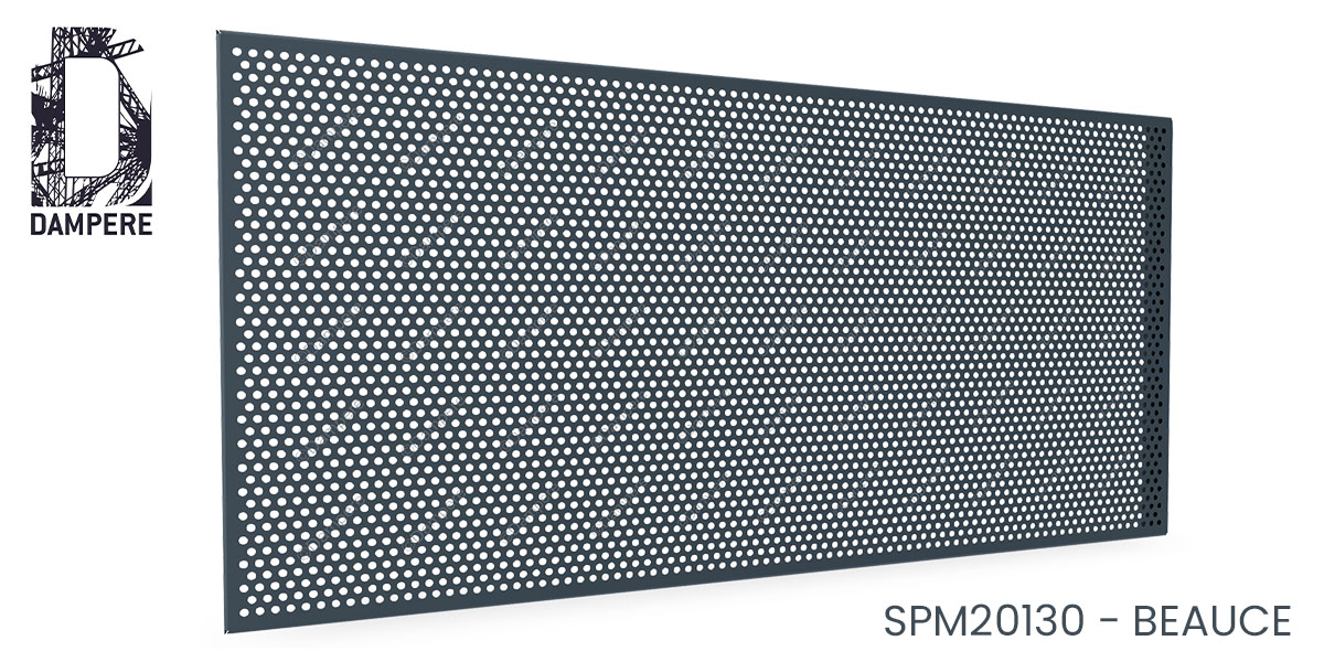Avec une transparence d’environ 29 %, elle permet une ventilation suffisante pour des applications de cache technique, de parement de façade ventilée ou de protection de machinerie, tout en masquant efficacement les éléments internes. La lumière s’y infiltre finement, filtrée, adoucie, créant un rendu uniforme et élégant. Le motif perforé en quinconce diffuse le flux lumineux en évitant tout alignement rigide, conférant au parement une texture quasi textile.
