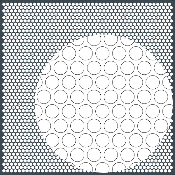 La tôle perforée R18T22 – Atete se distingue par sa grande ouverture et la douceur visuelle de son motif circulaire. Avec des trous ronds de 18 mm disposés en quinconce et un vide d’environ 60 %, elle évoque une matière légère, respirante, presque acoustique dans son comportement face à la lumière et à l’air.
