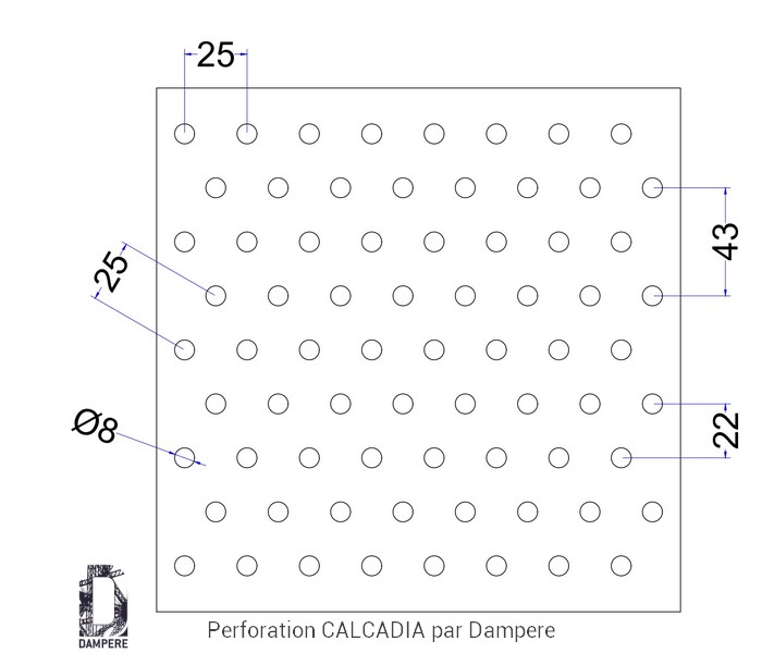 La tôle perforée R8T25 Calcadia privilégie la discrétion visuelle et la robustesse. Elle est composée de trous ronds de Ø 8 mm, disposés en quinconce en T sur un pas régulier de 25 mm. Référencée selon la norme Rv8-25, cette géométrie développe une transparence de 10 %. Ce niveau de transparence bas qui filtre la vue, limite l’éblouissement et protège efficacement les volumes, tout en conservant un passage mesuré pour l’air et la lumière.