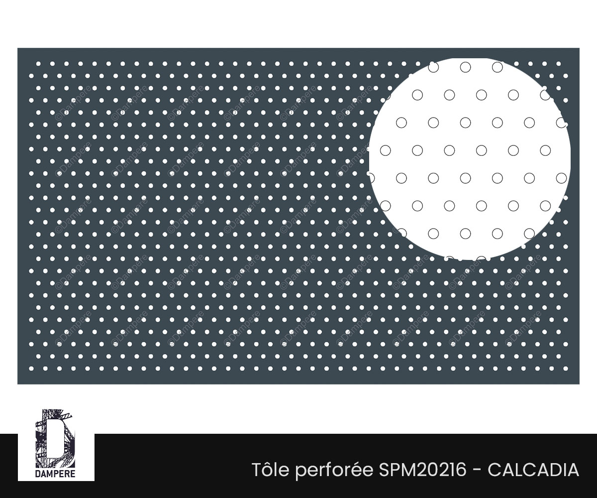 La tôle perforée R8T25 Calcadia se reconnaît à sa trame dense et régulière, offrant une transparence réduite à 10 % de vide. Cette perfo ronde en quinconce, à trous fins de 8 mm, compose une surface semi opaque, protectrice, idéale pour les applications où la sécurité, l’occultation et la robustesse priment sur la visibilité. Elle s’impose dans les enveloppes de bâtiments techniques, les locaux à usage sensible, les zones de maintenance, les soubassements.