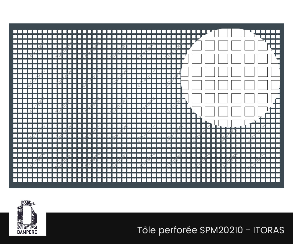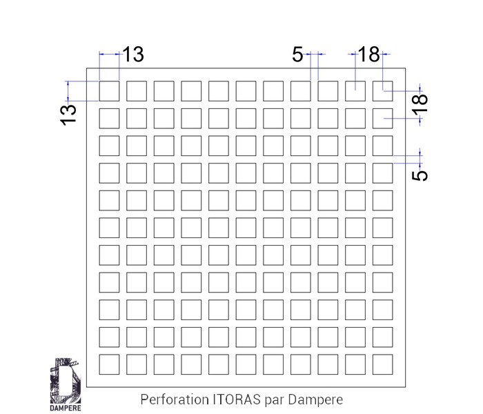 La tôle perforée C13U18 – Itoras offre un équilibre intéressant entre transparence et robustesse. Grâce à ses ouvertures carrées de 13 mm, réparties régulièrement selon un pas orthogonal de 18 mm, elle forme une trame Qg13-18 au design géométrique affirmé, avec un taux de vide de 52 %. Ce motif perforé présente des avantages multiples en matière de ventilation, de filtre visuel, et de polyvalence d’usages, tout en conservant une résistance mécanique satisfaisante grâce à ses 5 mm de pont de matière. La grille perforée C13U18 laisse largement passer la lumière et l’air, créant un jeu d’ombres nettes et un rendu graphique dynamique sur les façades. Elle s’applique bien en habillage de bâtiment tertiaire, de hall technique ou de logement collectif, pour offrir une respiration naturelle sans sacrifier l’esthétique. Le carré de 13 mm autorise une bonne transparence visuelle tout en donnant une sécurité dans la séparation. Parfait pour des clôtures urbaines, en zones résidentielles ou sur le périmètre des jardins publics. La structure reste suffisamment résistante aux sollicitations modérées (vent, projection), à condition d’être encadrée ou posée avec plis de renfort. La grille perforée C13U18 permet de structurer un espace tout en laissant circuler la lumière. En aménagement d’intérieur, elle s’intègre parfaitement dans les zones de transition (accueil, open space, hall tertiaire) où l’on souhaite un séparateur aérien au graphisme structuré. Idéalement utilisée en face de placards, portes d’îlot, cache radiateurs ou habillage muraux, notamment dans des environnements au style industriel, épuré ou graphique, le motif carré perforée C13U18 crée une identité visuelle forte tout en conservant une bonne fonctionnalité (ventilation, esthétique ajourée).