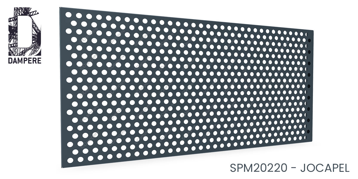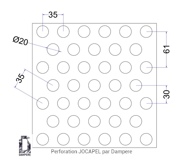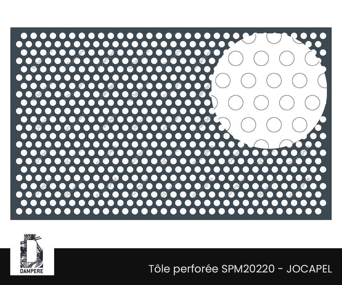 La tôle perforée R20T35 Jocapel propose une signature visuelle aérée mais mesurée : des ronds percés de diamètre Ø 20 mm agencés en quinconce sur un pas constant de 35 mm. Désignation normalisée Rv20-35, cette géométrie de perfo délivre environ 25 % de vide, un ratio pertinent quand l’objectif est d’assurer un passage d’air utile, une transmission lumineuse confortable et un allègement perceptible de l’enveloppe du bâtiment sans basculer dans la transparence élevée. La disposition en T de la maille triangulaire garantit une répartition uniforme des ouvertures : le tramage d’ombres reste doux et peu directionnel ; en lecture lointaine, la surface se perçoit comme un voile métallique régulier et apaisé. Le trou ajouré de diamètre Ø 20 mm imprime une écriture graphique lisible mais discrète. Selon la teinte appliquée, l’effet varie d’un rendu feutré (tons sombres) à une présence plus marquée (clairs, métallisés). Le motif se prête aux façades ventilées, écrans d’espaces techniques, masques d’unités CVC, parements rapportés et habillages de parkings lorsque l’on recherche un compromis entre ventilation, apport lumineux et confidentialité visuelle. Pour la perforation avec T = 35 mm et D = 20 mm, les ponts de matière en ligne atteignent environ 15 mm (T – D). En diagonale de la maille triangulaire, la réserve minimale d’épaisseur est d’environ 10,3 mm (√3/2 · T – D ≈ 30,31 – 20). Cette matière restante généreuse se traduit par une bonne rigidité et une stabilité en service, sous réserve d’un dimensionnement soigné : • en acier 2 mm, des formats non encadrés de taille raisonnable restent possibles ; • pour des surfaces plus vastes, adjoindre un cadre porteur soudé/boulonné et/ou des profils de raidissement ; • en sites soumis à grands vents, zones sollicitées (chocs, vibrations) ou pour grandes portées, viser 3 mm d’épaisseur, • calibrer le pas de fixation et multiplier les points d’appui sur la charpente secondaire. Bien soutenue par une ossature adaptée, la maille triangulaire diffuse efficacement les efforts dans les deux axes, ce qui confère à la tôle perforée une tenue fiable malgré l’ajourage. Les ajours de diamètre Ø 20 mm procurent un débit d’air appréciable tout en limitant les vues directes. Pour les garde-corps En acier galvanisé épaisseur 2 mm, la tôle perforée R20T35 se situe généralement entre 53 € et 92 €/m² autour de 100 m² de fourniture, selon l’épaisseur, la finition, la trame de pose, la présence de cadres/raidisseurs et le contexte de chantier. Un ajourage modéré comme 25 % de vide maintient une masse correcte par m², favorisant la rigidité.