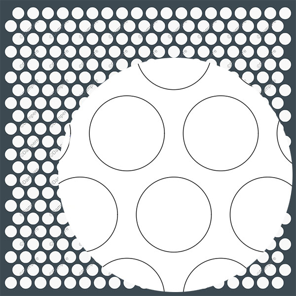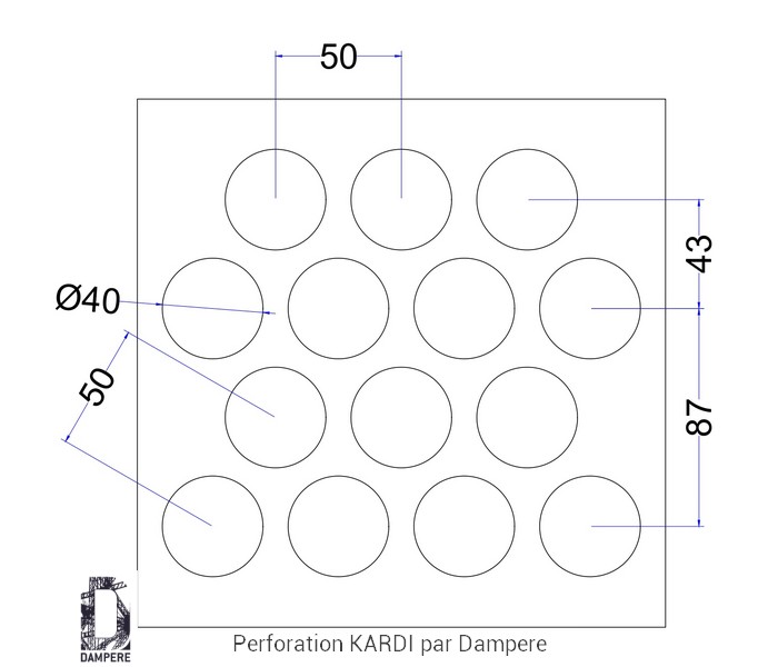 La tôle perforée R40T50 Kardi propose une signature visuelle très aérée et lumineuse : des ronds de diamètre Ø 40 mm agencés en quinconce sur un pas constant de 50 mm. Désignation normalisée Rv40-50, cette géométrie perforée délivre proche de 60 % de vide, un ratio pertinent quand l’objectif est d’assurer un fort passage d’air, une transmission lumineuse généreuse et un allègement perceptible de l’enveloppe. La maille de perforation triangulaire garantit une répartition uniforme des ouvertures : le tramage d’ombres reste doux et peu directionnel ; en lecture lointaine, la surface se perçoit comme un voile perforé homogène et très respirant.