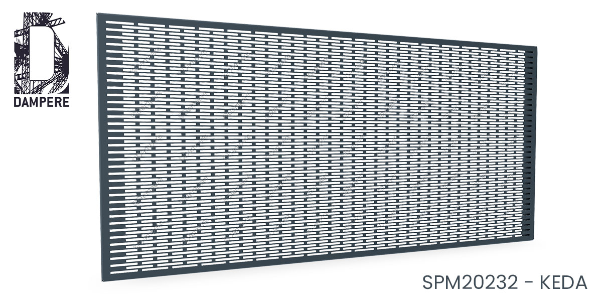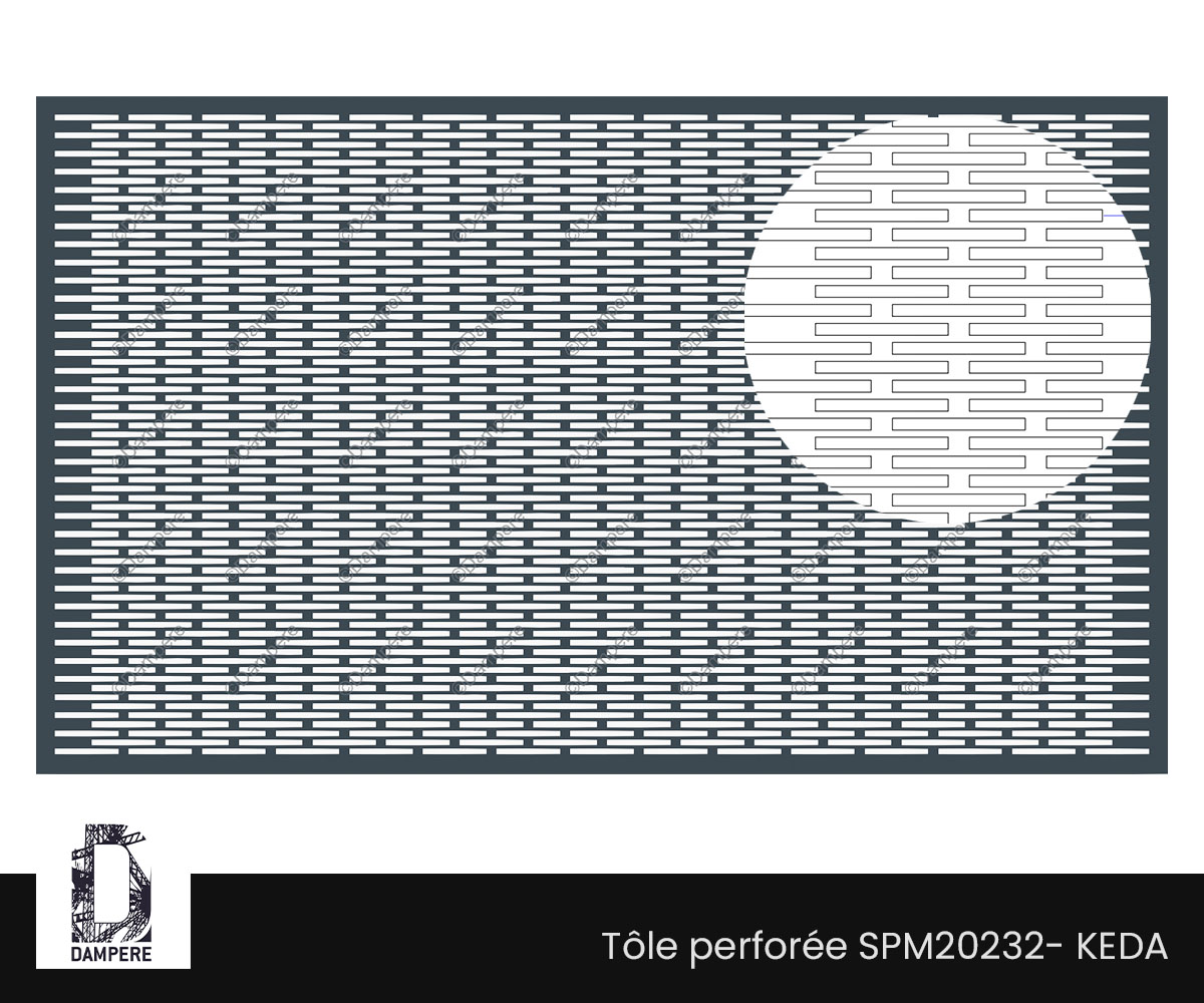 La tôle perforée REC 5×56 Z 8×65 – Keda propose une écriture de la résille métallique étirée et très respirante : des trous rectangulaires de 5×56 mm, disposés en quinconce sur un pas de 8 mm dans la petite direction et 65 mm dans la grande donnent une belle illusion optique. Dans cette géométrie perforation régulière, le vide opérationnel dépasse 60 %, un niveau élevé de transparence lorsque l’objectif recherché est d’assurer un fort passage d’air dans un mécanisme de ventilation, une transmission lumineuse généreuse d'un brise vue et un allègement visuel marqué de l’enveloppe du Bâtiment. La disposition décalée en "Z" de la tôle perforée homogénéise la diffusion des ouvertures et adoucit les formes pour activer l'effet de mirage : en lecture lointaine, la surface perforée se perçoit comme un voile métallique très aéré, tandis que de près, le trou rectangulaire allongé dessine une trame fine et directionnelle.