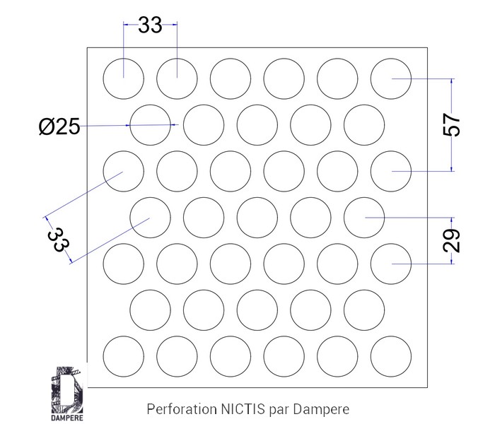 La tôle perforée R25T33 Nictis revendique une esthétique très ouverte et lumineuse : des ronds perforés de diamètre Ø 25 mm disposés en quinconce sur un pas régulier de 33 mm. Référencée par nomenclature Rv25-33, cette géométrie perforée offre une transparence supérieure à 52 %, idéale lorsque la priorité va aux forts débits d’air, à la diffusion généreuse de lumière et à l’allègement visuel des enveloppes techniques. La trame en quinconce répartit les ajours de façon isotrope : les ombres sont moirées, douces et peu directionnelles ; à distance, la peau se lit comme un voile homogène et très respirant, une résille métallique discrète. Le trou de diamètre Ø 25 mm imprime un langage graphique affirmé selon la couleur appliquée, lisible de loin mais pouvant rester subtil sur teintes sombres. Le motif perforé convient aux façades respirantes, écrans de locaux machines, caches de groupes HVAC, masques de parkings et bardages secondaires quand ventilation et transparence priment. En application dans un milieu urbain, la transparence de 52 % demeure élevée : elle s’emploie avec discernement selon les besoins d’occultation, d’anti-intrusion et de protection aux projections. Métal perforé avec T = 33 mm et D = 25 mm, la ligature métallique résiduelle en ligne est d’environ 8 mm (T–D), tandis que la ligature minimale en diagonale de la trame triangulaire est d’environ 3,6 mm (√3/2·T – D). Cette réserve de matière, modeste, impose un dimensionnement rigoureux : • en acier 2 mm, limiter la taille des panneaux non encadrés (formats unitaires modestes) ; • privilégier un cadre périphérique soudé/boulonné et/ou des plis de raidissement ; • en zones exposées (vent, chocs, vibrations) ou pour grandes portées, viser 3 mm d’épaisseur ; • rapprocher les entraxes de fixation et multiplier les points d’appui sur la structure. Correctement dimensionnée, la trame perforée en T diffuse bien les efforts dans les deux axes et permet une tenue fiable malgré l’ouverture notable. Des ajours de diamètre Ø 25 mm assurent un passage d’air conséquent. Pour les garde-corps de balcon et zones accessibles au public, vérifier les condistions d'implantation. En acier galvanisé ép. 2 mm, le prix de la tôle perforée R25T33 se situe généralement entre 59 € et 95 €/m² autour de 100 m² de commande, selon l’épaisseur, la finition, le calepinage, la présence de cadres/raidisseurs et les contraintes de pose. Rappel : des ajours généreux allègent la masse perforée et rendent la résille métallique très légère ; ils exigent en contrepartie une ossature lisible et des épaisseurs adaptées, potentiellement visibles au travers de la tôle perforée.