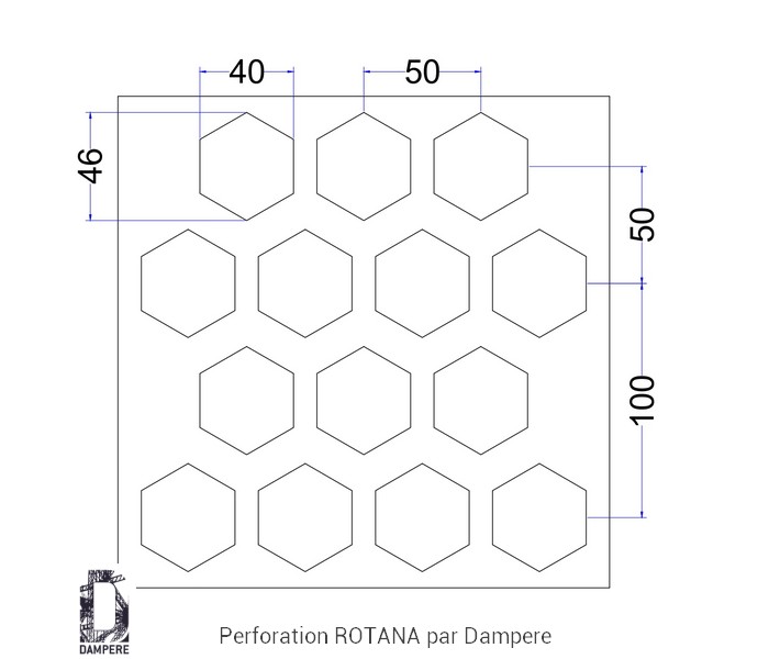Tole perforée de type Nid d'abeille ou Honeycomb avec une ouverture Hexagonale H = 40 mm et un pas Z = 50 mm, les ponts de matière sont d’environ 10 mm sur les axes principaux, légèrement inférieurs dans certaines diagonales de la maille triangulaire. Cette réserve de matière impose une conception attentive :