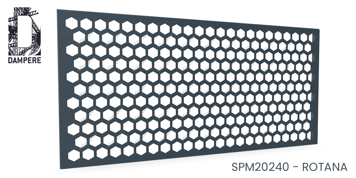 La tôle perforée Rotana s’utilise pour les façades ventilées, les garde-corps ajourés, les clôtures de sites publics, les brise-vues décoratifs et les enveloppes de parkings ou d’équipements techniques. Son motif hexagonal généreux favorise la circulation de l’air et de la lumière, tout en maintenant une lecture géométrique claire et structurée. La disposition en quinconce adoucit l’effet de grille et produit une perception fluide, rythmée et naturelle, inspirée des structures biologiques. Cette perforation, à la fois ouverte et stable, confère à la tôle Rotana un rôle de filtre lumineux et d’élément graphique fort pour les architectures contemporaines.