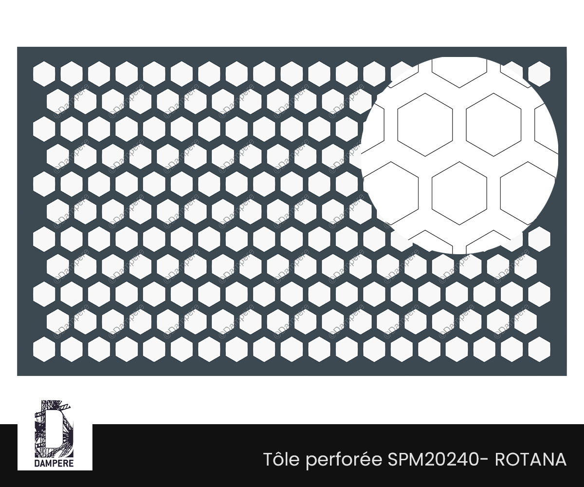 La tôle perforée Rotana convient aux façades ventilées, parements rapportés, brise-vues décoratifs, habillages de parkings et écrans pour équipements CVC, ainsi qu’aux claustras et faux-plafonds à motif graphique. Le motif “nid d’abeille” offre une présence contemporaine, plus architecturée qu’une grille orthogonale, avec un bon compromis entre transparence et masquage de l’arrière-plan selon l’éclairage.