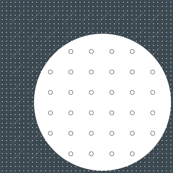 La tôle perforée R5U25 Yote propose une écriture visuelle très fine et régulière : des ronds perforés de Ø 5 mm agencés en alignement orthogonal sur un pas constant de 25 mm. Sous la désignation de nomenclature standard de perforation Rg5-25, cette géométrie perfo délivre environ 3 % de vide, un niveau très bas lorsqu’il s’agit de privilégier l'occultation, une transmission lumineuse limitée et une micro-ventilation contrôlée. La grille de perforation orthogonale produit une répartition directionnelle des ouvertures : la pénombre dessine un léger quadrillage discret; en lecture lointaine, la surface se perçoit presque comme une peau pleine, à peine ajourée. Le trou perforé de diamètre Ø 5 mm confère une présence graphique très mesurée, quasi ponctuelle. Cette tôle d'oc ultation est indiquée pour des parements rapportés, capotages d’appareillage, habillages d’espaces techniques, écrans de protection et faux-plafonds lorsque l’on recherche avant tout la confidentialité visuelle, une esthétique apaisée et une aération minimale. La tôle perforée R5U25 avec U = 25 mm et D = 5 mm, les ponts de matière atteignent environ 20 mm dans les deux directions. Cette réserve de matière très confortable se traduit par une rigidité élevée et une excellente stabilité en acier 1.5 mm, des formats non encadrés de taille significative sont envisageables jusqu'à 1.5 m² sans problème. Les trous perforés de diamètre Ø 5 mm limitent fortement les vues directes, l’éblouissement et la pénétration d’objets, avantageux en zones accessibles au public que l'on doit occulter complètement tout en laissant passer un minimum d'aération. En acier galvanisé épaisseur 1.5 mm, la tôle perforée R5U25 se situe généralement entre 42 € et 75 €/m² autour de 100 m² de fourniture, selon l’épaisseur, la finition, la trame de pose. Une transparence faible de 3 % maintient une masse par m² élevée, favorable à la rigidité et à la perception d’une peau quasi pleine, mais attention au poids lors de l'installation sur chantier.